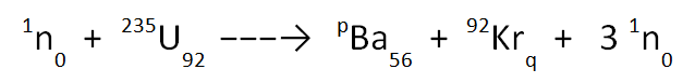 On the top row of the equation we have; 1 + 235 → p + 92 + (3 x 1). This gives a value of p equal to 141. Note that the large “3” acts to multiply everything that follows it; both the 1 at the top and the 0 at the bottom.