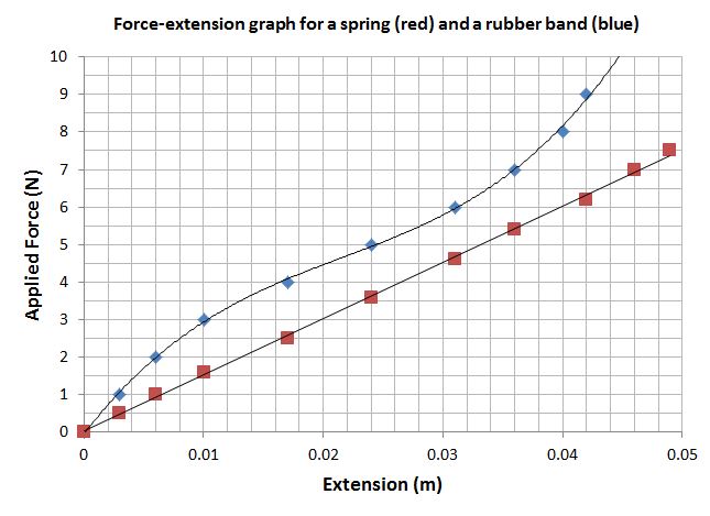 Look at the graph below and have a go at describing what it shows for the distortion of a spring and a rubber band. Be specific!