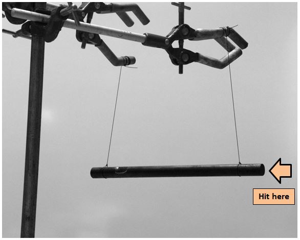We have carried out an investigation to determine the speed of sound in a solid using the frequency of the note that is heard when a suspended iron bar is hit sharply using a hammer. The apparatus used is shown in the diagram below. The frequency of the sound was measured using software installed on a smartphone that was held close to the iron bar.
