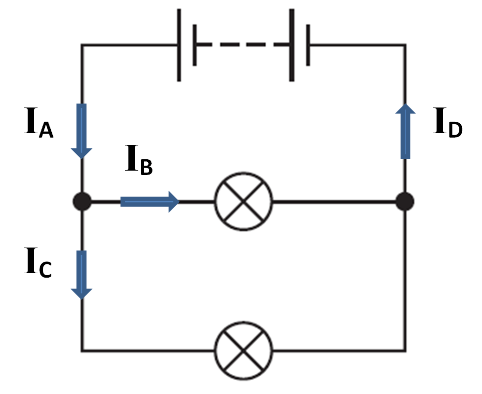 Kirchhoff’s current law states that the sum of the currents flowing into a junction in a circuit is equal to the sum of the currents flowing out of the same junction. For us, this is particularly useful when looking at junctions in parallel circuits, as shown below.