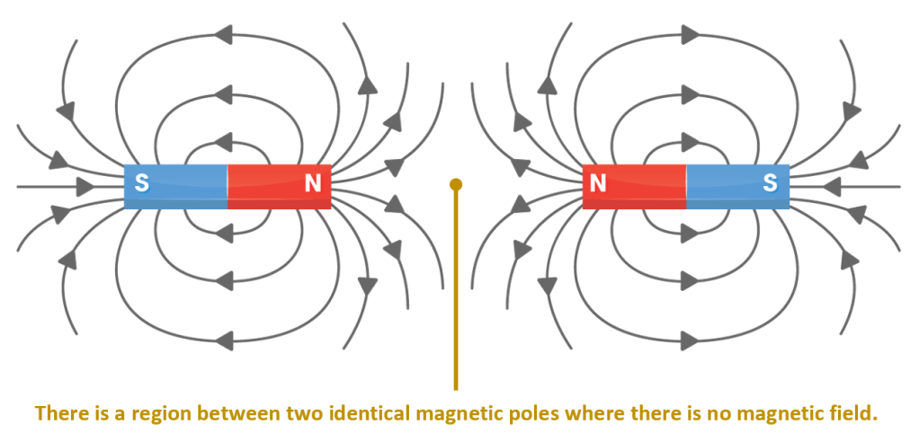 Rotating one of the magnets, so the identical poles now face each other, results in the two sets of magnetic field lines pointing in opposite directions. These forces act not only on an imaginary north monopole (as noted above) but also on the magnetic field lines themselves. There is even a region between the two identical poles where the magnetic field lines have completely repelled each other, meaning that there is no magnetic field in this central area, as shown in the image below.