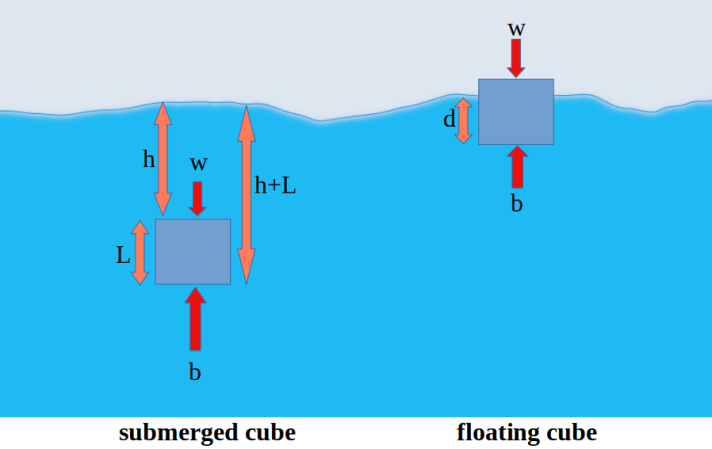 To keep matters simple, we will think only about a cubic object but the same ideas apply to all objects. The cube has side length L and the top surface is at a depth h below the fluid’s surface. This means that the bottom surface is at a depth of h+L so experiences a greater pressure than the pressure that acts on the top surface. This in turn generates an upward force called buoyancy, which acts in the opposite direction to the object’s weight. If the buoyancy is greater than the cube’s weight then the net force will be upwards and the cube will rise to the surface. But if the resultant force is less than the cube’s weight, the cube will move downwards (sink).
