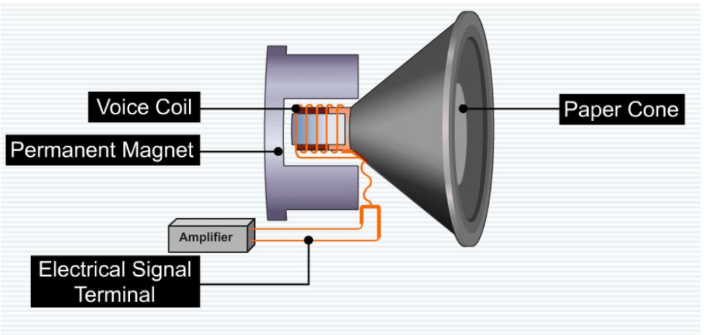 In the case of a loudspeaker (shown above) an alternating current with the same frequency as the desired sound is amplified and sent to the coil. The coil moves backwards and forwards due to the force that is created by the coil’s magnetic field interacting with the loudspeaker’s permanent magnet. The paper cone moves with the coil and makes the air vibrate at the same frequency, creating sound.