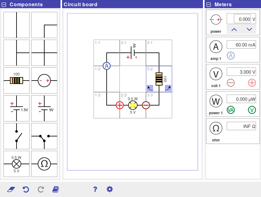 To access the simulator, go to https://www.golabz.eu/lab/electrical-circuit-lab then select Preview (top right). Don’t worry if you get an error message saying that collaboration is not enabled: you don’t need it to build your own circuits. Then just drag components from the component area (on the right) into the circuit board area (centre).