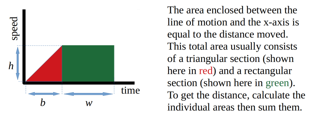 The third point above needs a little more explanation. You need to know that the area “under” a speed-time graph is equal to the distance moved. So if we measure the area that is contained between the line of motion and the x-axis, the value we obtain will be the distance travelled by the object.