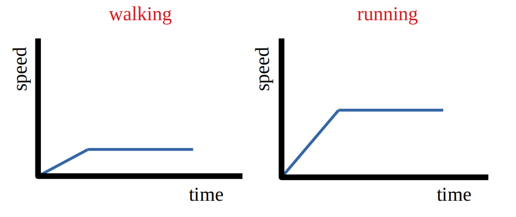 In real life, there is a progressive transition between the two types of motion as the acceleration decreases to zero in order to achieve a steady speed. This is shown in the illustration below, which tracks Usain Bolt’s motion during his 100 m sprint at the Beijing Olympic Games in 2008.