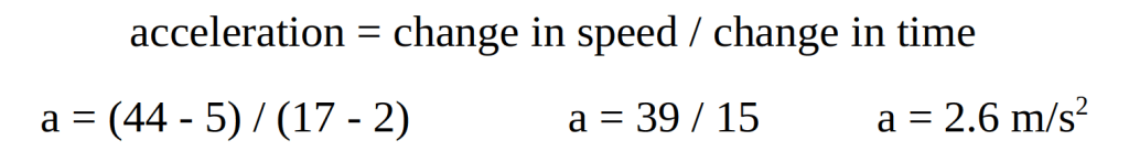 Acceleration is the rate of change of speed (we will leave aside velocity for now) and that means we can calculate acceleration if we know the speed of an object at two different times. The object’s acceleration is given by its change in speed, divided by the time interval.