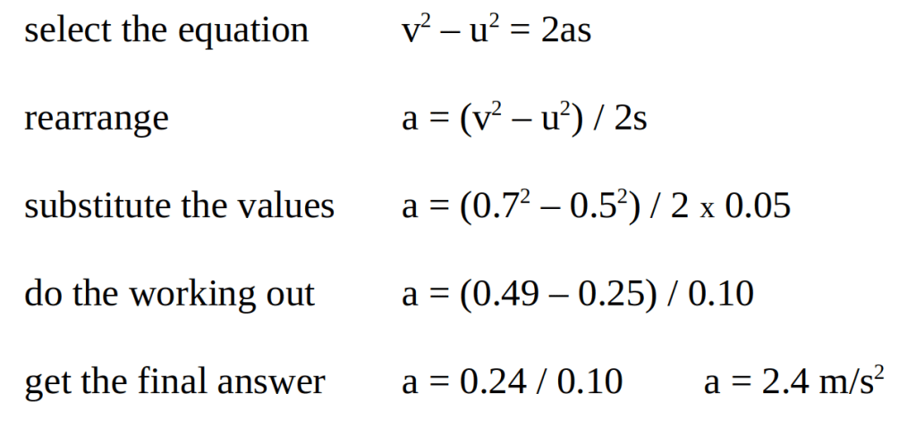 For example, suppose that a model race car has speeds of 0.5 m/s and 0.7 m/s at two positions that were 10 cm and 15 cm from the start. What is the acceleration of the car?