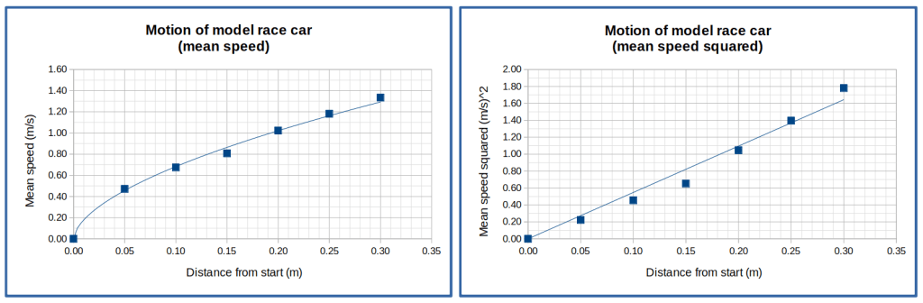 The trend line goes through the point (0.09, 0.50) and the point (0.22, 1.20) so the gradient is given by (1.20 – 0.50) / (0.22 – 0.09). This expression simplifies to 0.70/ 0.13, which works out to 5.4. That value needs to be halved to get acceleration of the model car, which is therefore 2.7 m/s2. This answer is slightly higher than the value calculated earlier but you will notice that the trend line is steeper above the two distance values used, which were 0.10 m and 0.15 m, so the discrepancy is not surprising. You should be able to explain why the value taken from the graph is likely to be more accurate (closer to the true value).