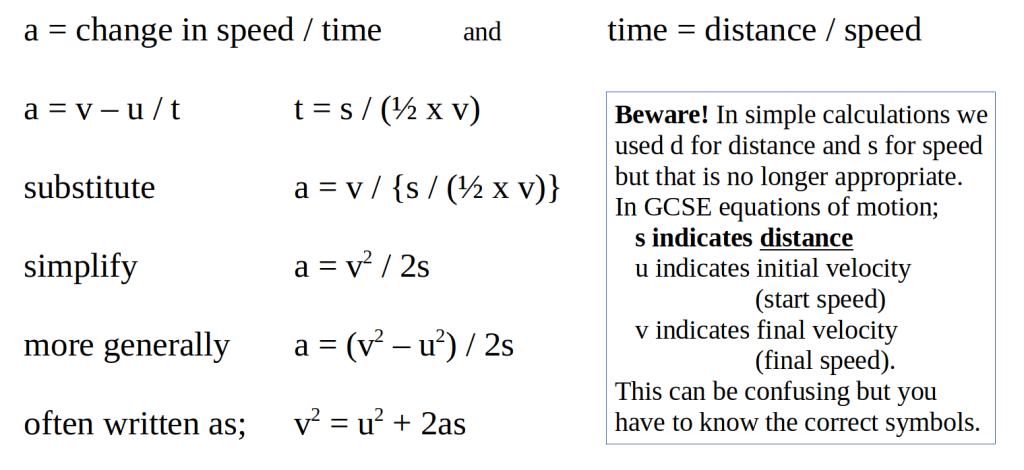 We can combine these facts to produce an equation that links acceleration to velocity (speed) and distance, as shown below. Note: you can skip this bit if it looks scary!