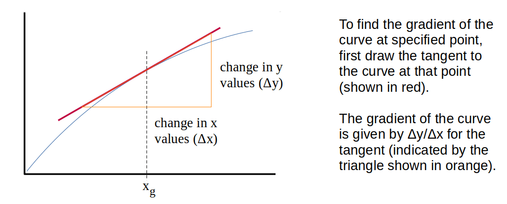 As a final comment, before moving on, it is important to add that gradients can be calculated for curved lines as well as straight lines. The method is the same – once an equivalent straight line has been identified. This is done by drawing a tangent to the curve at the point where the gradient is to be measured. The gradient of the tangent is equal to the gradient of the curve at that point, as illustrated in the diagram below.