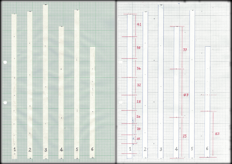I’ve dropped a mass, with ticker tape attached, and cut the trace into lengths that have been stuck on graph paper for ease of measuring. In the diagram below, the original sections are shown on the left and my measurements for some of the individual distances are shown on the right. You will notice that there is a steady increase in the distance between the dots at first but at the end of the drop there appears to be some random variation.