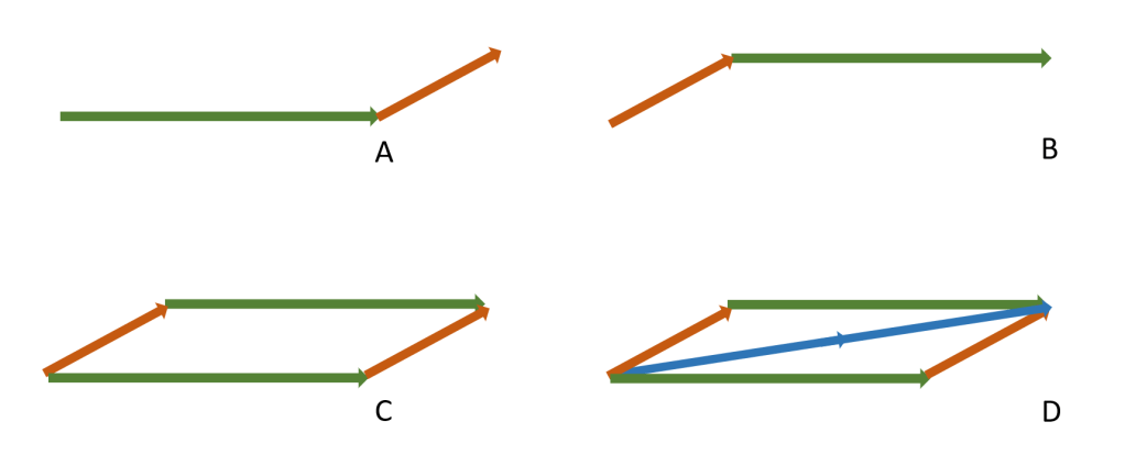 - In diagram C, diagrams A and B have been combined: it is clear that the same end point is reached regardless of the order in which the two component vectors are drawn.