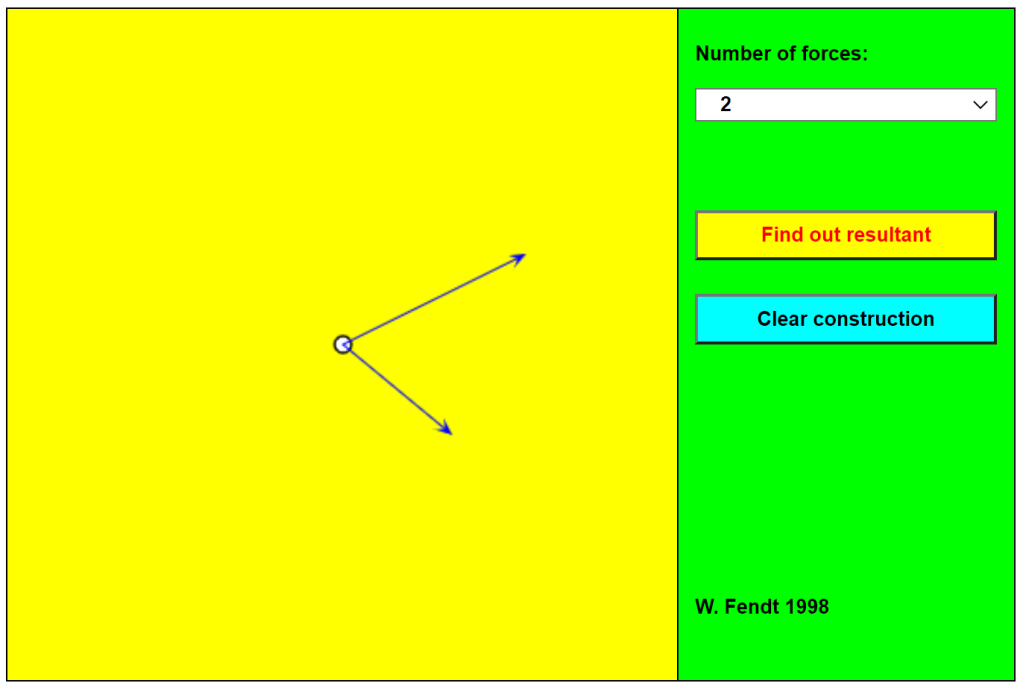 To change the sizes and directions of the component forces (shown with thin blue arrows) just click and drag the arrowheads to the desired positions. Then click on the Find Out Resultant button and watch as one of the component vectors is moved (by parallel translation) to be placed nose-to-tail with the other. The resultant is then displayed as a thick red arrow.