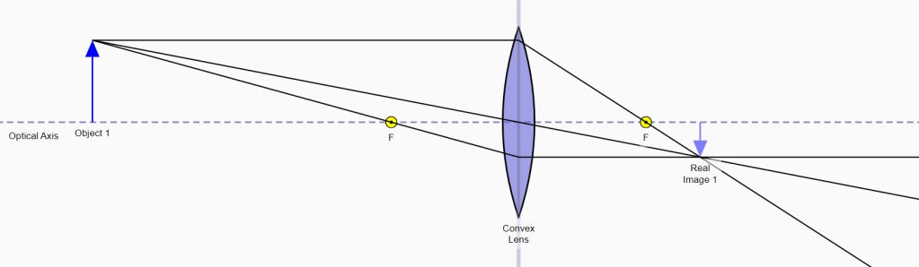 These three rays all converge at a point that marks the top of the image (because they originated from the top of the object). Conveniently, the object was stood directly on the optical axis so the image must be “suspended” below the optical axis. This arrangement does not have to be the case: it just makes things simpler here.