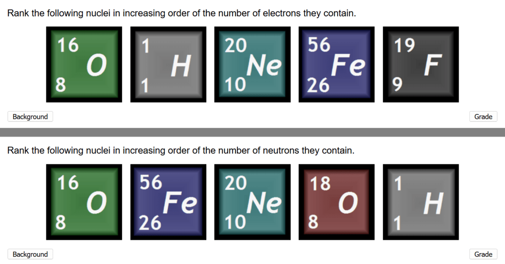 A really nice touch is that sometimes the number of neutrons can be the same for two different atoms. Fortunately, it doesn’t matter which atom you put first as the grading scheme marks both as correct. The bottom row of the example shown above includes this situation, which is made possible by the use of different isotopes.