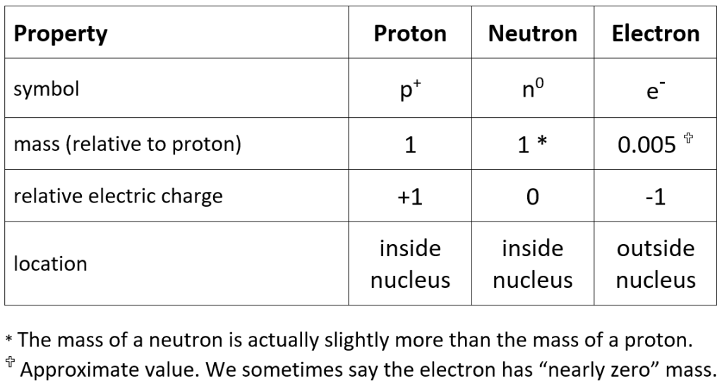 The table below lists the essental information you need to know about the three sub-atomic particles; protons, neutrons and electrons.