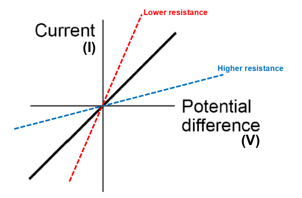 Ordinary resistors have a fixed resistance or one that can be varied manually and then stays constant. This means that the current-voltage graph for a fixed resistor has a straight line. A steeper line means a lower resistance, and vice-versa. Remember this fact because you could be asked to add a line to a current-voltage graph to show the behaviour of a component that has a lower (or higher) resistance than the one already shown, as indicated below.