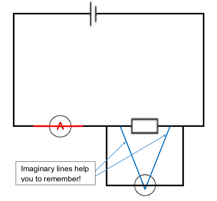If you extend the V of the voltmeter symbol you get two “leads” that need to be connected to different sides of a component because they point in different directions. And if you extend the line in the middle of the A in an ammeter symbol it will join straight on to the lines (wires) to each side of the circle, so an ammeter can be drawn straight over the wires of a circuit but a voltmeter has to be outside the circuit. These two tricks are illustrated below.