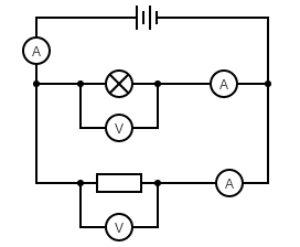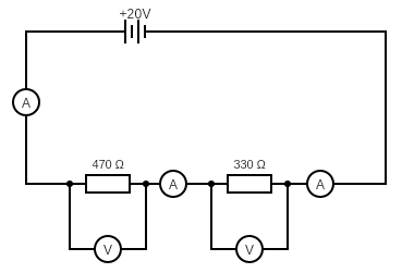 In the circuit above, the readings on all three ammeters would be the same and the readings on the two voltmeters would add up to give 20 V, which is the potential difference (voltage) of the battery.