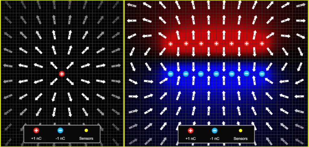 The potential fields around positive charges always have positive values and decrease to zero, indicating that a repulsive force will act on any positive test charge that is within such a field. Conversely, the potential fields around negative charges always have negative values and rise to zero, indicating an attractive force acting on a positive test charge.