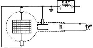 In theory, the various equations that have been stated throughout this explanation could all be combined to produce a complete expression that determines the amount of deflection in terms of the strength of the acclerating field (giving the electron’s horizontal velocity) and the strength of the deflecting field (which determines the electron’s vertical motion). In practice, however, it is safer to calculate each stage separately to avoid carrying-over hidden errors from one part of the calculation to another.