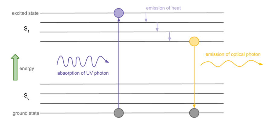 The second stage of the process uses the fact that the inside surface of the fluorescent tube is coated with a powder that absorbs the ultraviolet photons. Some of the absorbed energy is transferred as heat but the remainder is released as a photon with lower energy than the incoming UV photon. The difference in energy for the incoming and emitted photons “converts” invisible UV photons into a specific frequency of visible light, as shown below.