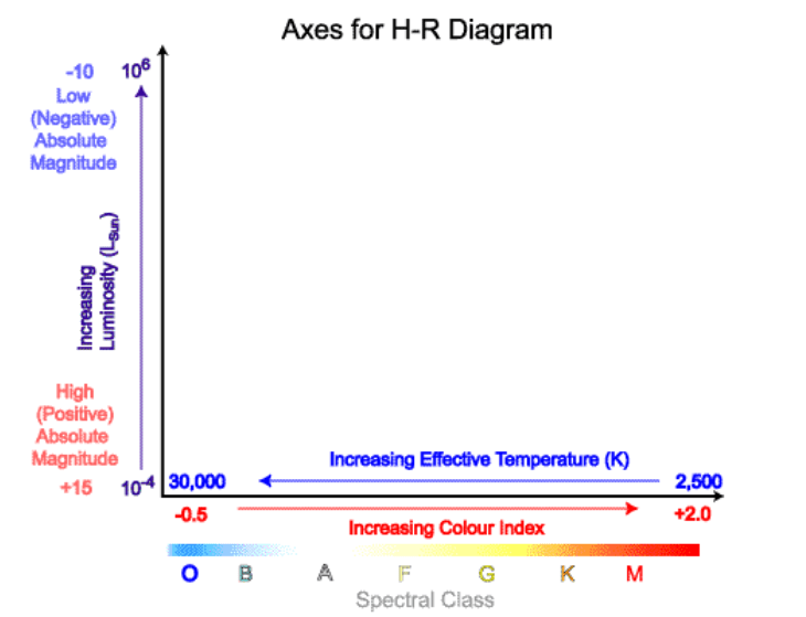 - The x-axis can be marked by spectral class (OBAFGKM) in equal intervals: the option to use colour index can be ignored for A-Level physics
