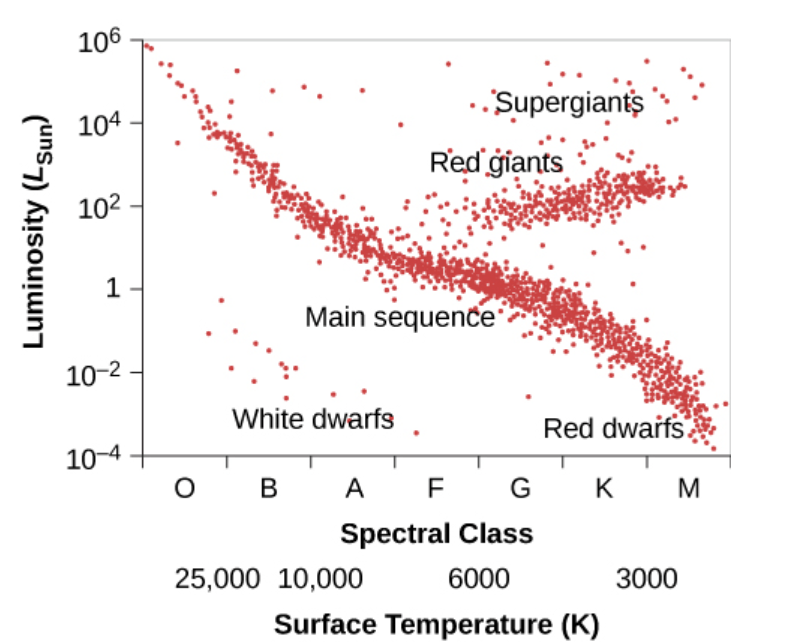 This question was investigated by Hertzsprung and Russell (separately) just over 100 years ago. A short historical summary is given at the end of this article but from an examination perspective it is important to focus on the key features of the modern Hertzsprung-Russell diagram, as shown below.