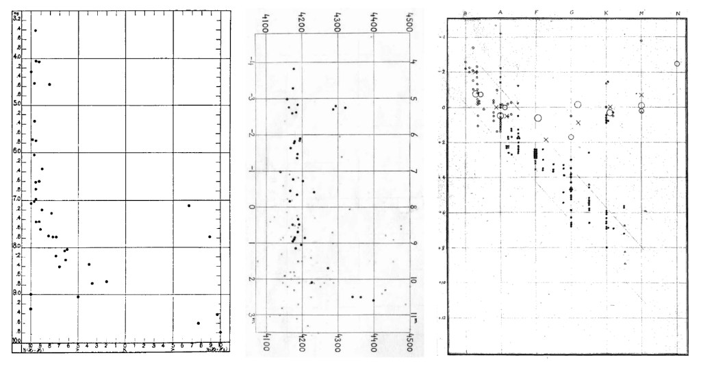 An illustration containing the first plots published by Rosenberg (1910), Hertzsprung (1911) and Russell (1914) is shown below for comparison.