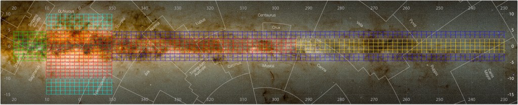The extent of the new survey, which encompasses data from the VVV and VVX surveys, is conveyed in the image below, where each small square is one component of the complete area that has been captured.