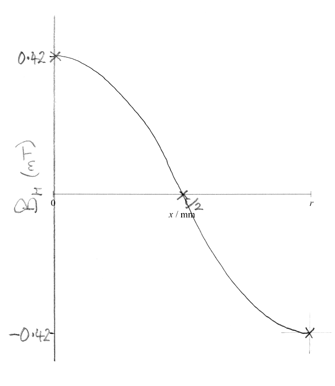 To score full marks you needed to label the y-axis correctly and mark the maximum and minimum values (0.42 mT and –0.42 mT respectively) with the x-axis intercept at r/2 and a smooth curved line through these points, as shown below.