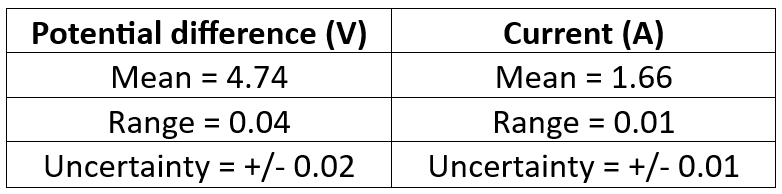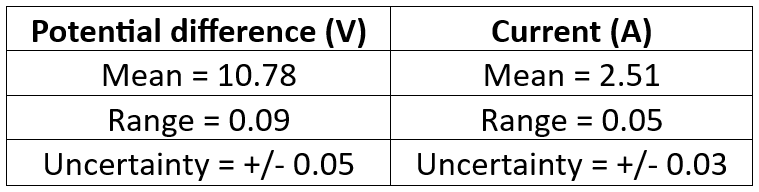 In order to calculate the resistance of the filament lamp, we must divide the mean potential difference by the mean current. To calculate the uncertainty in the resistance, we must sum the percentage uncertainties in the two means.