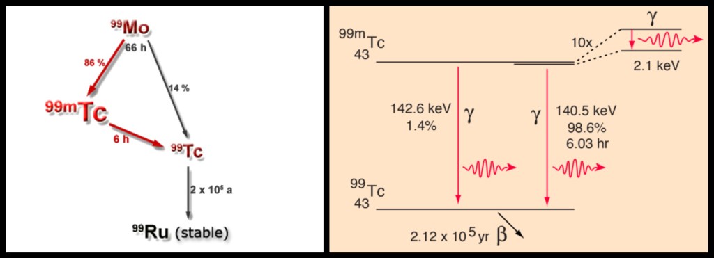 At first glance the decay of molybdenum-99 to produce technetium-99 is a straightforward beta process. The total number of nucleons is unchanged but the number of protons increases by one with the emission of an electron and an electron-antineutrino. The half-life for this decay is 66 hours.