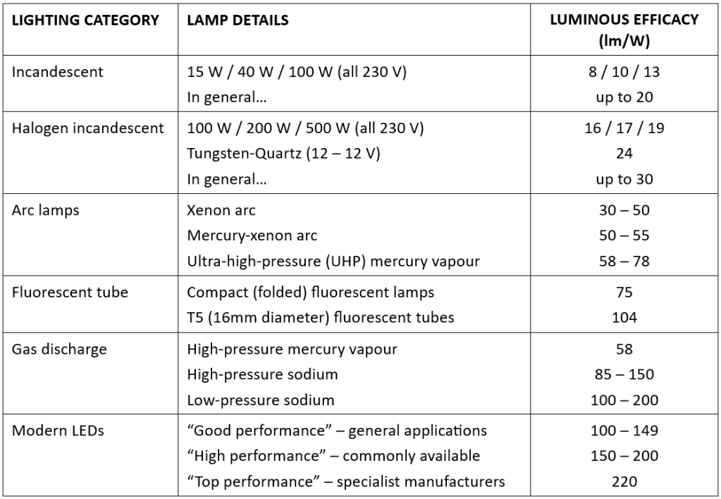 Although lumens-per-watt sounds like an efficiency figure, it is not a true efficiency as it is not stated as a percentage. The correct term is for lumens-per-watt is luminous efficacy. Appropriate figures for different types of light sources are compared in the table below which contains information taken from the websites of LED specialists LEDrise and TriLux.