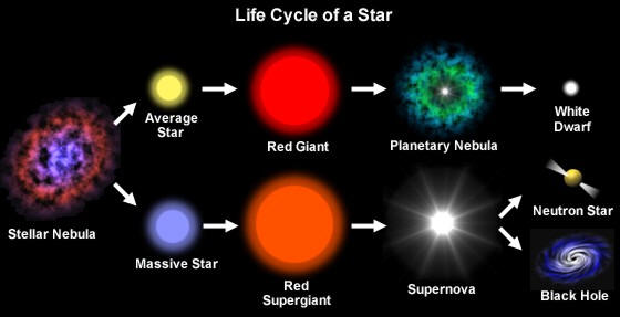 As the star’s hydrogen becomes depleted, the outward pressure decreases and the core starts to collapse. This process raises the core temperature sufficiently for helium to undergo fusion, producing carbon and oygen, which in turn increases the star’s diameter, turning the outer surface red. Stars in this phase of their evolution are known as red giants. In the case of our Sun, the expansion will be enough to swallow-up the orbits of mercury and venus – and possibly the Earth too.