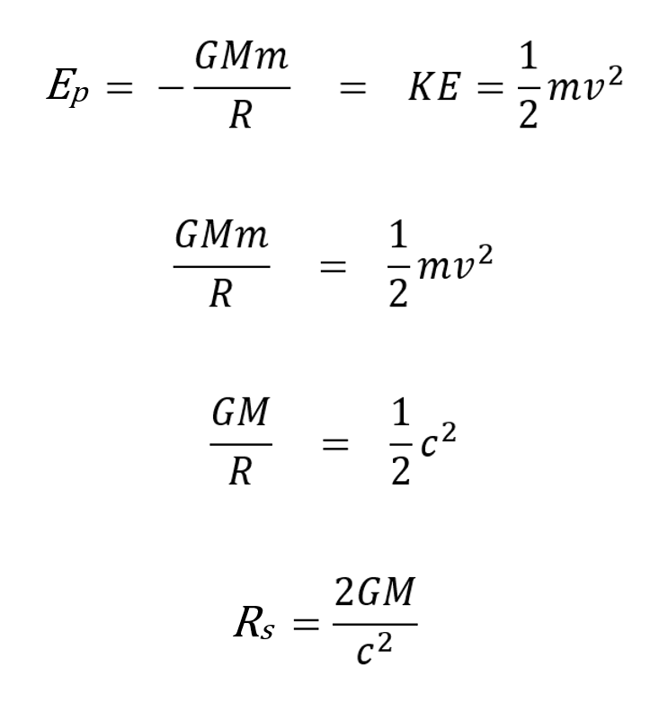The A-level Physics syllabus offers a quick way to calculate the Schwarzschild radius for a given core mass by using the escape velocity calculation outlined above. We will ignore the fact that light (a photon) has zero rest mass, and therefore classical kinetic energy is not applicable, because the result is correct even though the logic presented here is questionable.