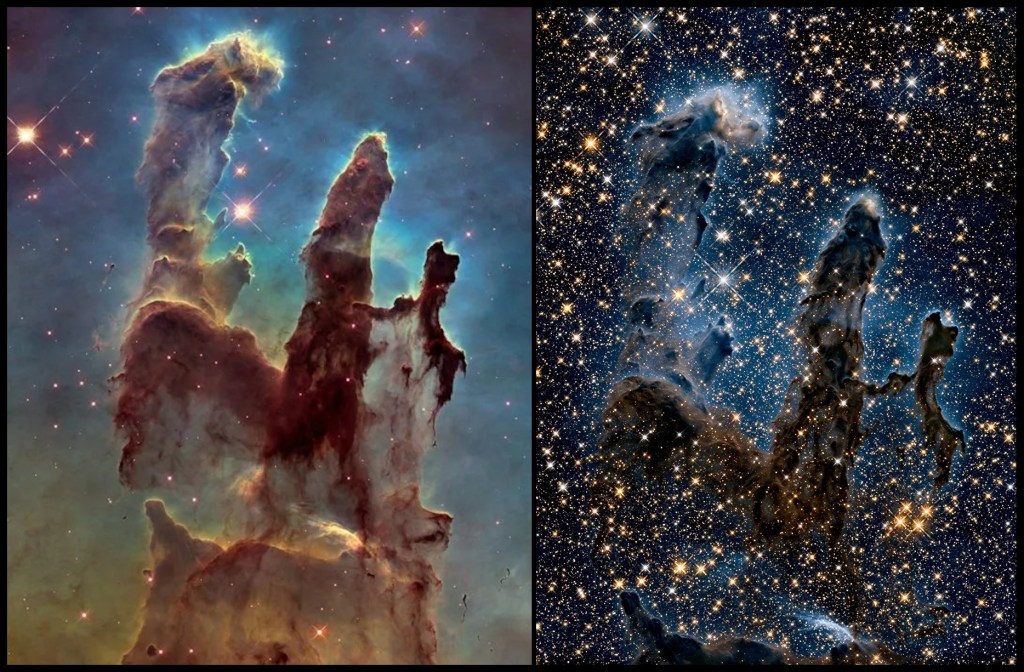 The problem is that the “clumps” are irregularities within larger clouds that are opaque to visible light. Fortunately, infra-red radiation is able to penetrate through the clouds, revealing the stellar nurseries that exist inside. The images below, taken by the Hubble Space Telescope using visible-light and infra-red cameras, highlight the massive advantage that infra-red imaging has brought to astronomy.