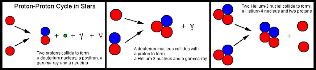 Logically, it would seem to make sense for bigger stars to shine for longer but that isn’t the case because the rate of reaction is faster in higher-mass stars. In all cases, however, the hydrogen fusion process is the same and is known as the proton-proton cycle because it starts and ends with protons, as shown in the diagram below.