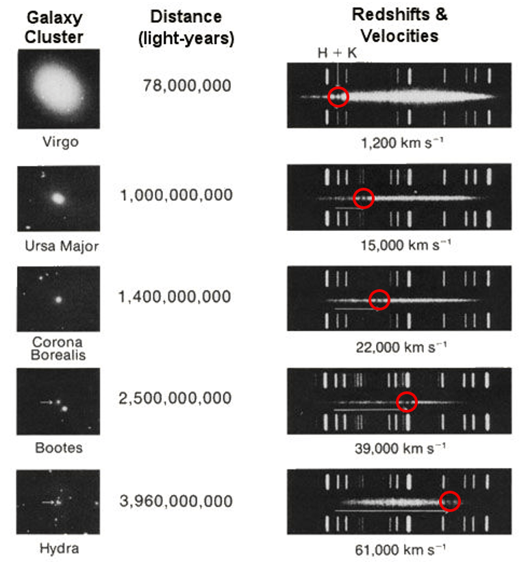 Hubble applied the Doppler effect to objects in space by building on previous work by Vesto Slipher and further observations by his own assistant, Milton Humason. When Hubble analysed the spectra of distant objects, he found their prominent absorption lines (the calcium H and K lines) were shifted towards the red end of the spectrum in comparison with laboratory spectra – hence the name “red-shift”. He also noticed that this effect was greater for objects that were more distant. This is illustrated below for distances up to 3.96 billion light-years. (Hubble’s initial work was limited to a much smaller range of distances: the maximum shown in Plate VIII of his 1936 book, The Realm of the Nebulae, was just 135 million light-years.)