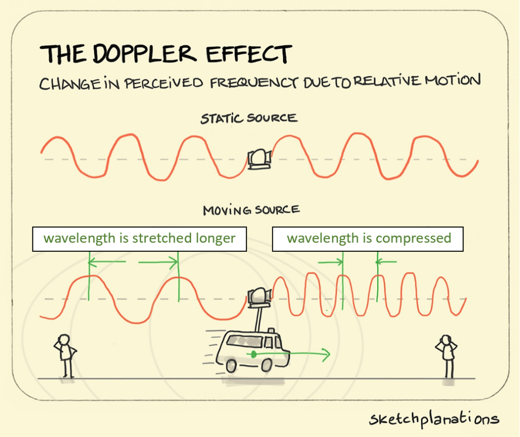 The crucial thing to know is Hubble’s analysis was based on the Doppler effect, which describes the change in pitch heard when a fast-moving vehicle speeds past a stationary observer. As the vehicle approaches, the pitch of its engine (for a race car) or its siren (for an emergency vehicle) has a high-pitch sound but when it passes by the pitch drops as the sound changes to a longer wavelength.